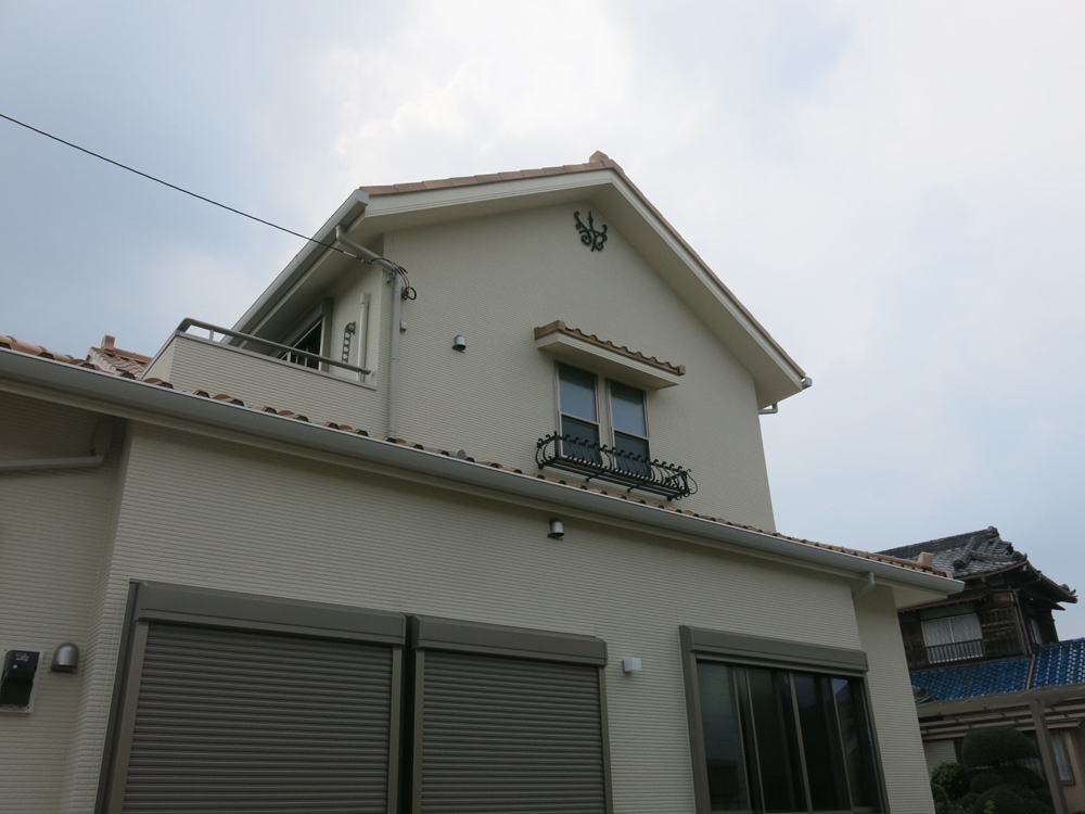 1階が30坪ほど、2階が半分の15坪程で下屋が美しい木造2階建てです。南仏をイメージした外観ですが、日本瓦の1/6の重量の金属瓦を採用し、外壁は窯業系のサイディングと軽量にすることで、耐震性が上がりました。