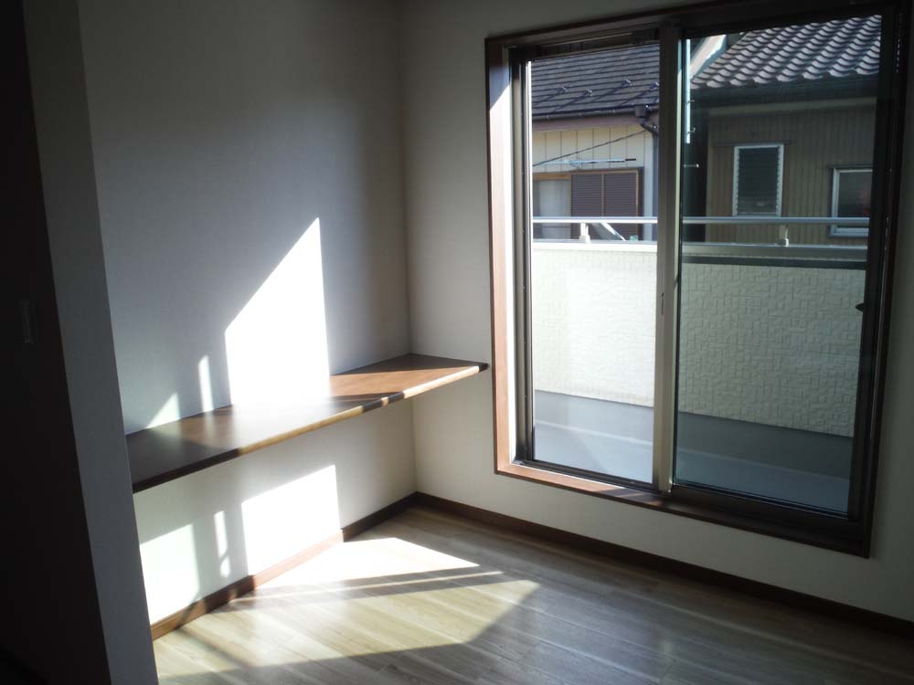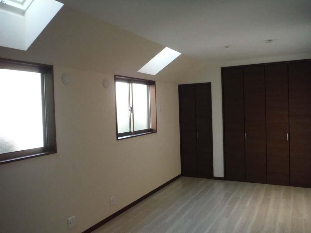 2階は真ん中に収納のあるセミセパレートな主寝室、将来仕切ることができ北面ながらもトップライトで明るい子供部屋があります。